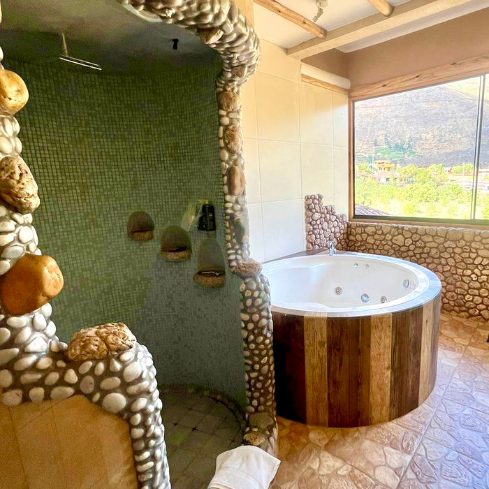 There is an en suite bathroom with jacuzzi tub and rock shower.